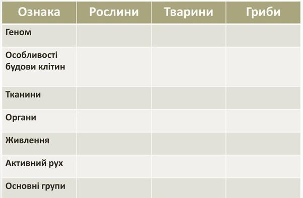 Таблиця порівняльна характеристика рослин, тварин і грибів (на фото)