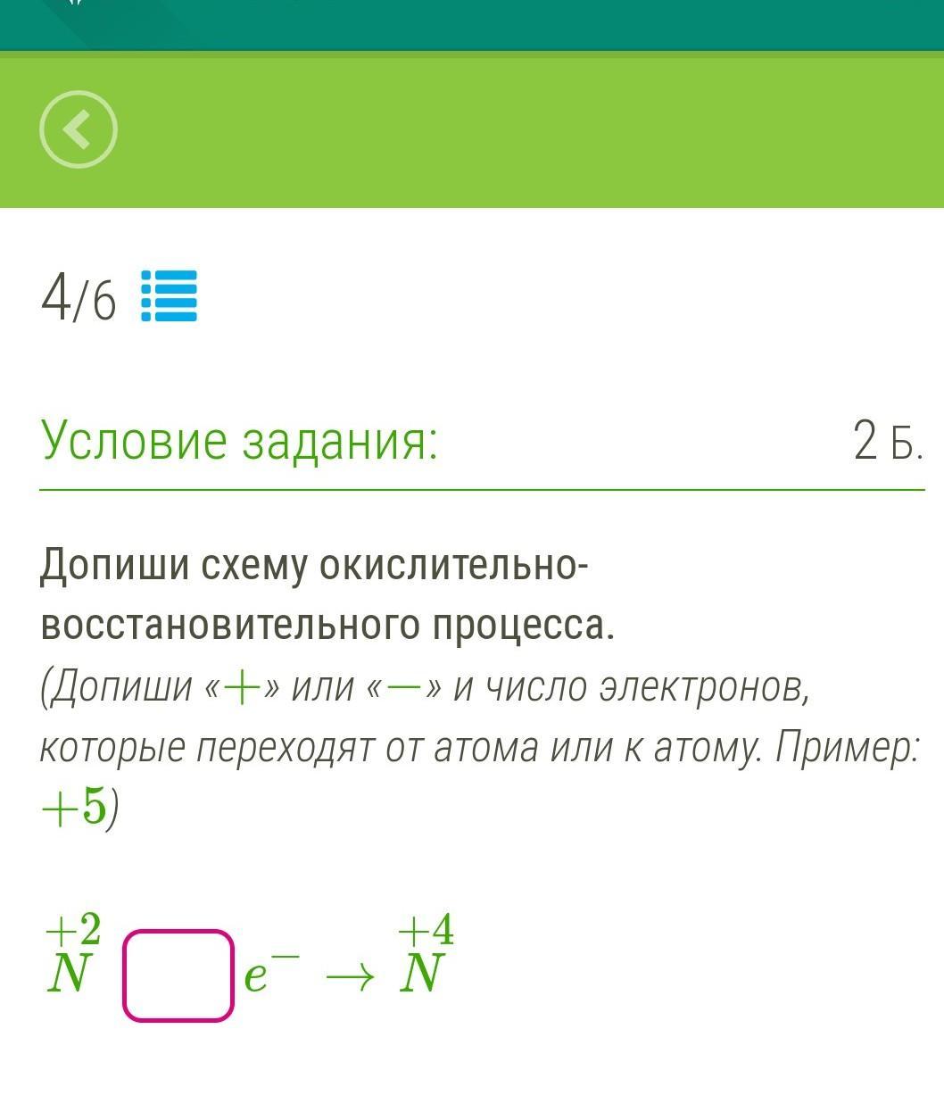 Допиши схему окислительно- Восстановительного процесса. (Допиши «+» или «—» и число электронов, которые переходят от атома или катому. Пример: +5) +4 +2. N z Оe е — N