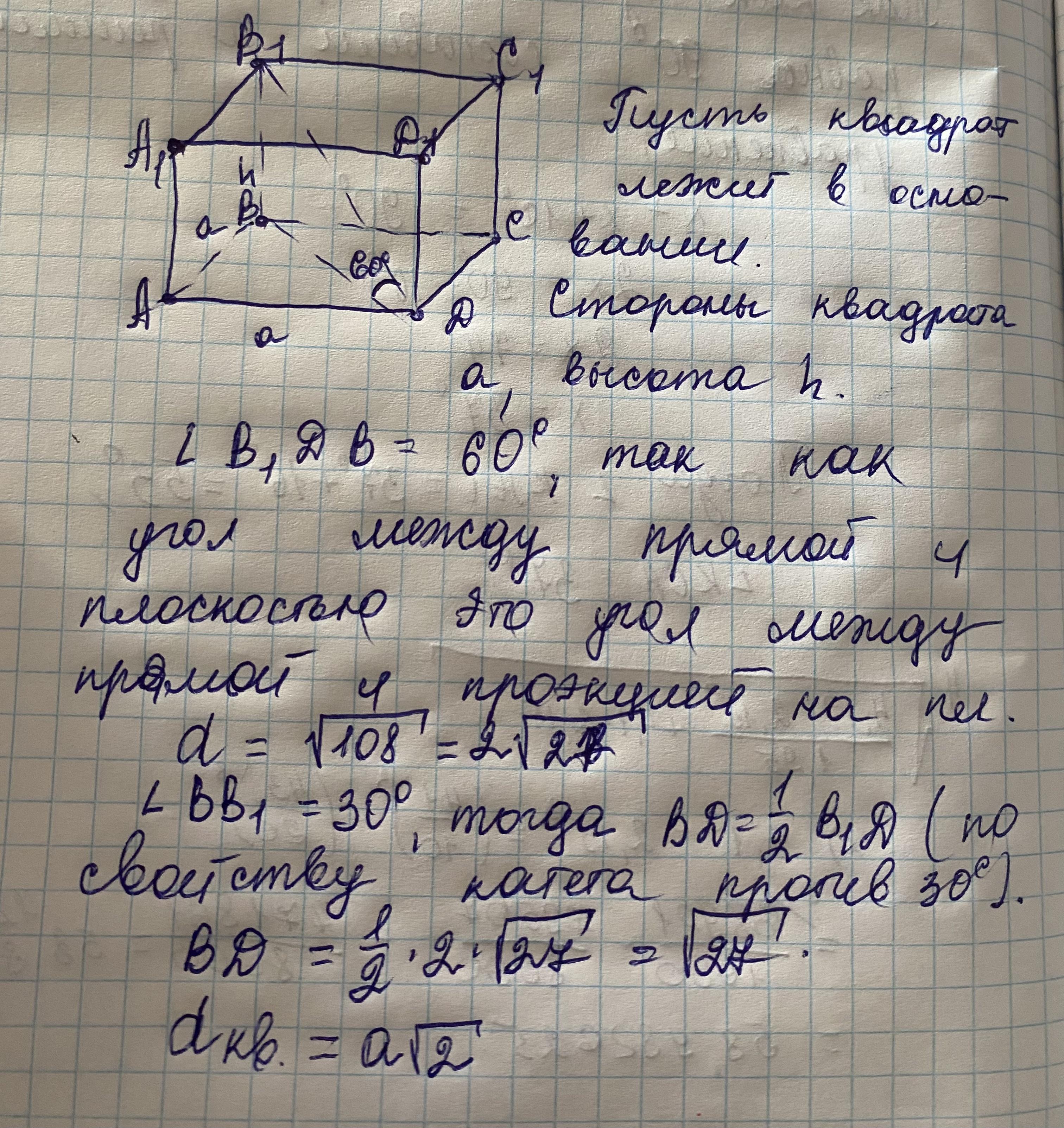 Одна из граней прямоугольного параллелепипеда — квадрат. Диагональ параллелепипеда равна корень из 108 и образует с плоскостью этой грани угол 60°. Найдите объем параллелепипеда.