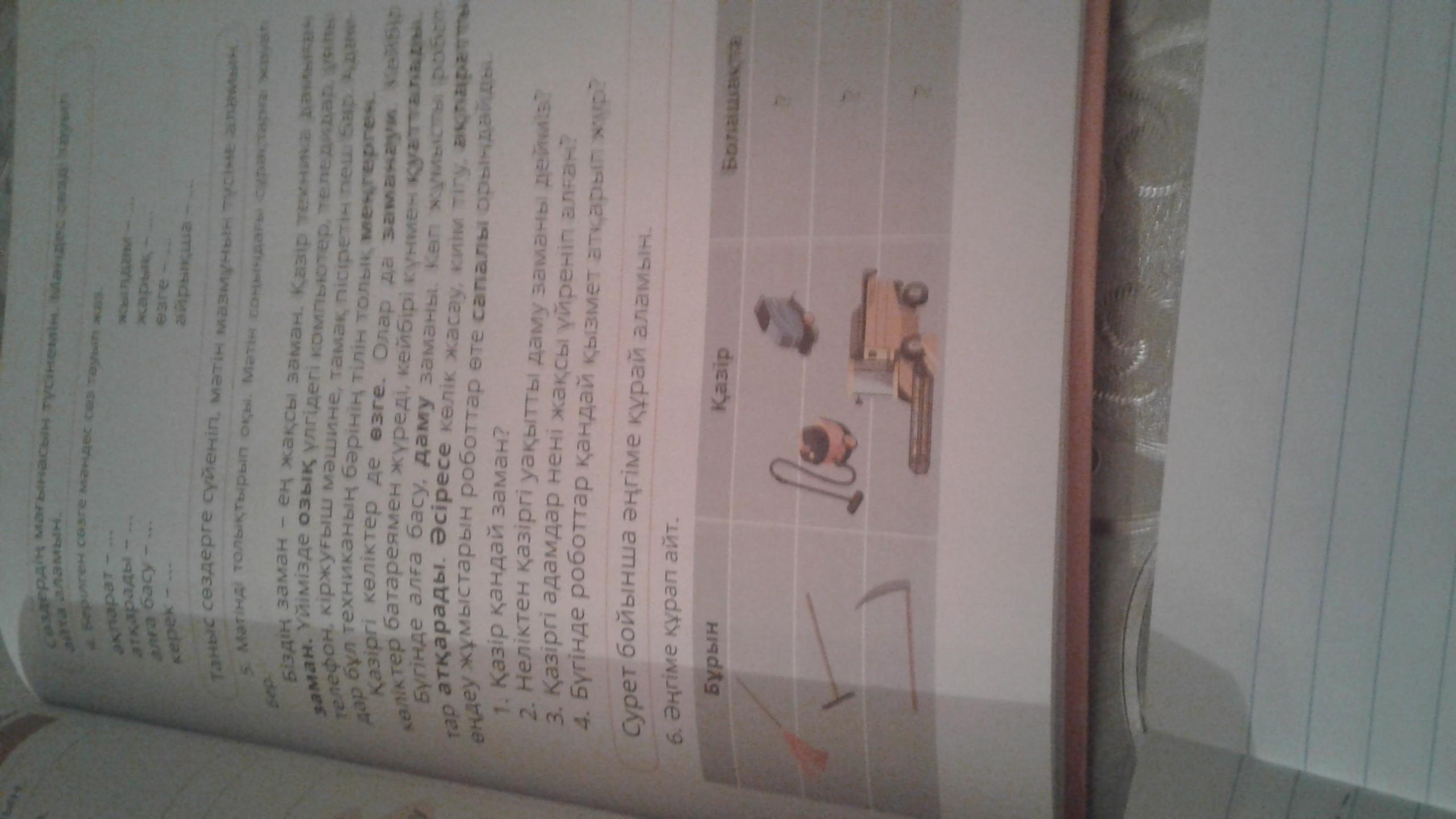 1) бұрвн бізде спырғы болған.Ал қазір бізде арнайы тазалайтын бар.2) Бұрын бізде үй жинайсвн спырғы болған,ал кәзір шаңсорғыш бар соның арқасында үйді.тез жинаймыз. Бұрын бидай оратыр орақ болған,ал кәзір комбайн бар
