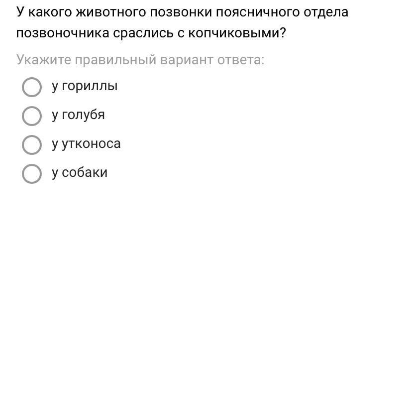 У какого животного позвонки поясничного отдела позвоночника сраслись с копчиковыми? Помогите пожалуйста
