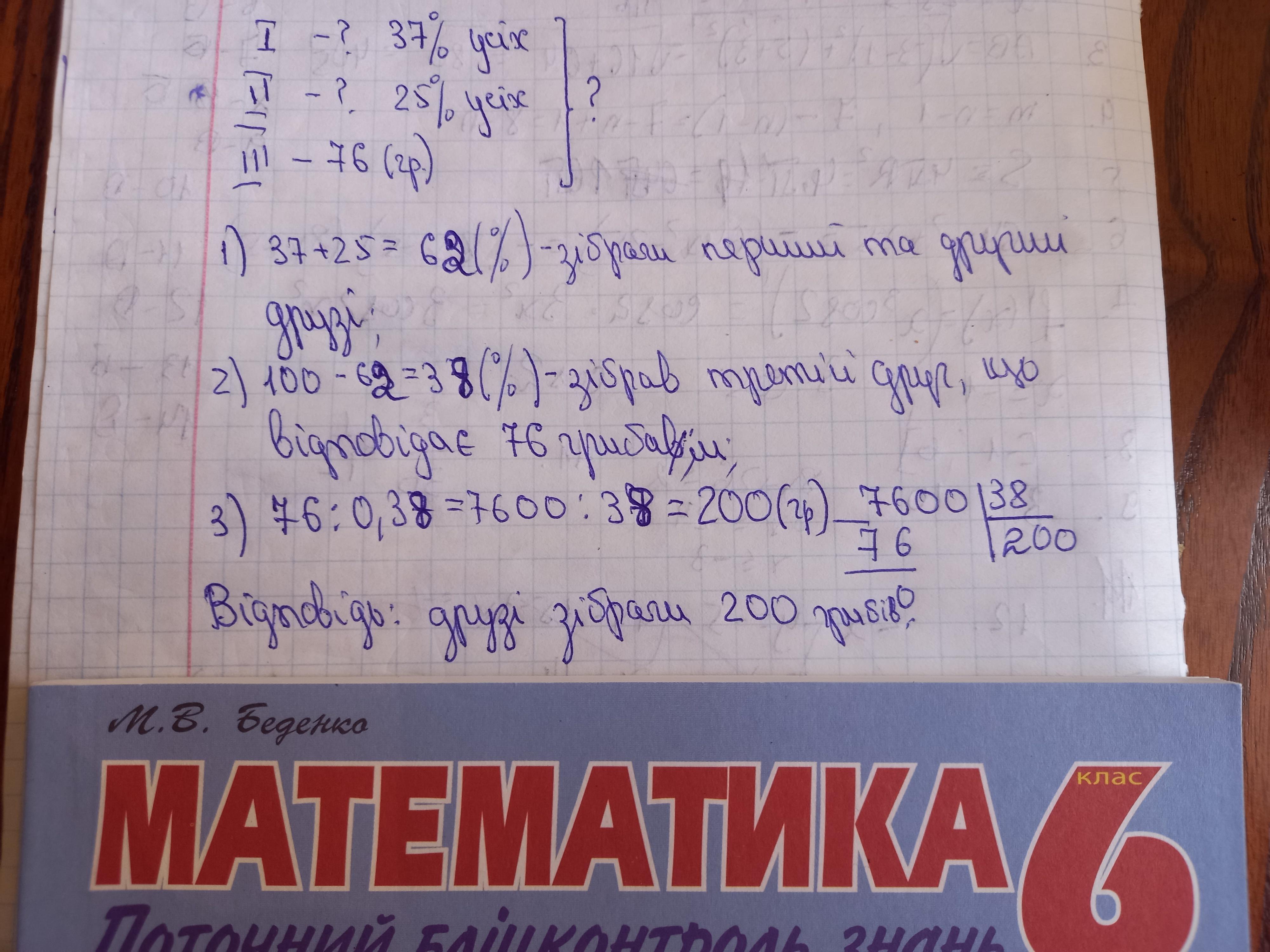Троє друзів збирали гриби. Перший зібрав 37% усіх грибів, другий-25%, а третій-решту 76 грибів. Скільки всього грибів вони зібрали ?
