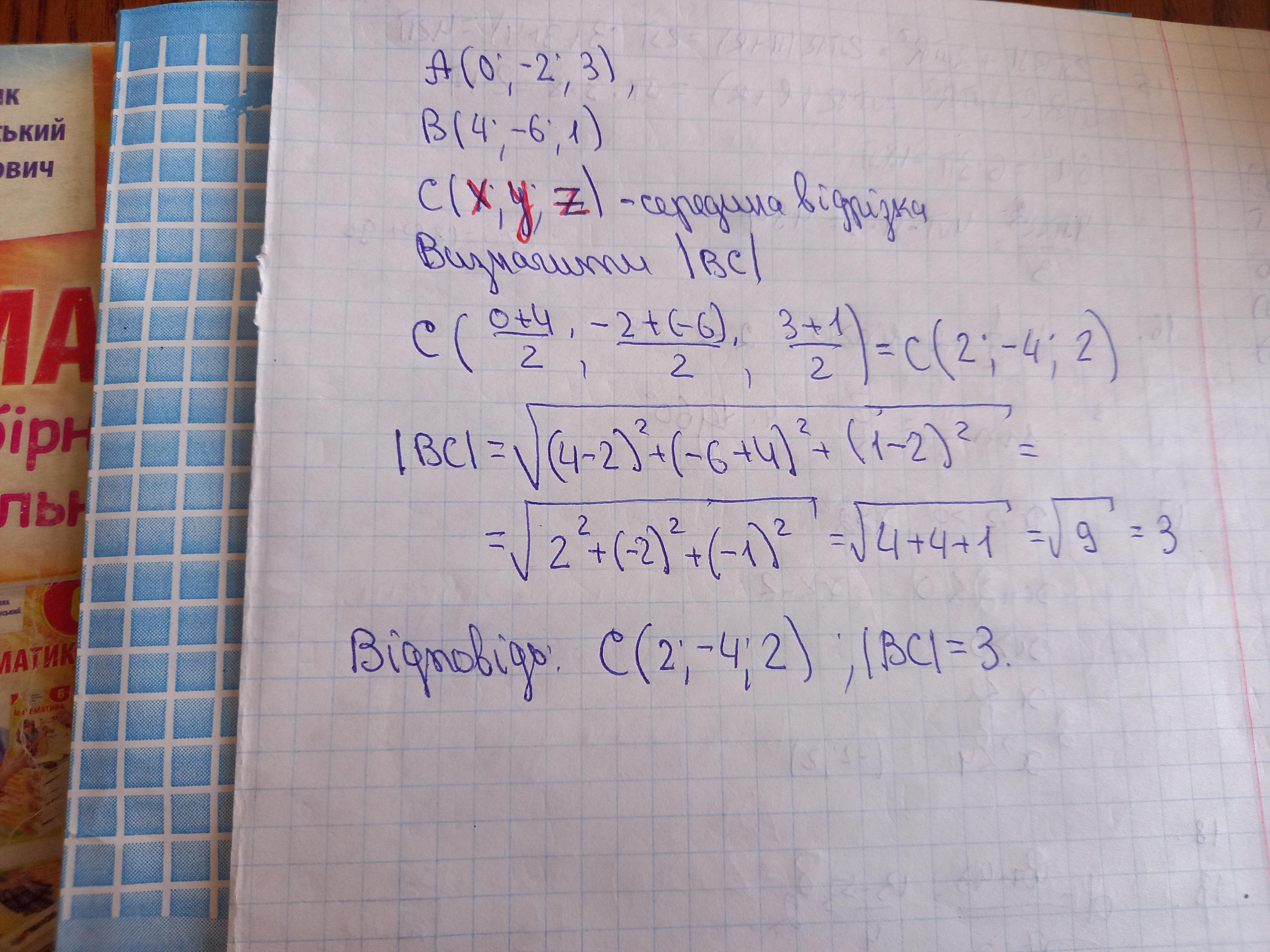 Точка C-середина відрізка АВ. Знайти кординати точки С якщо A (0;-2;3); B (4;-6;1) Обчислити |BC|.