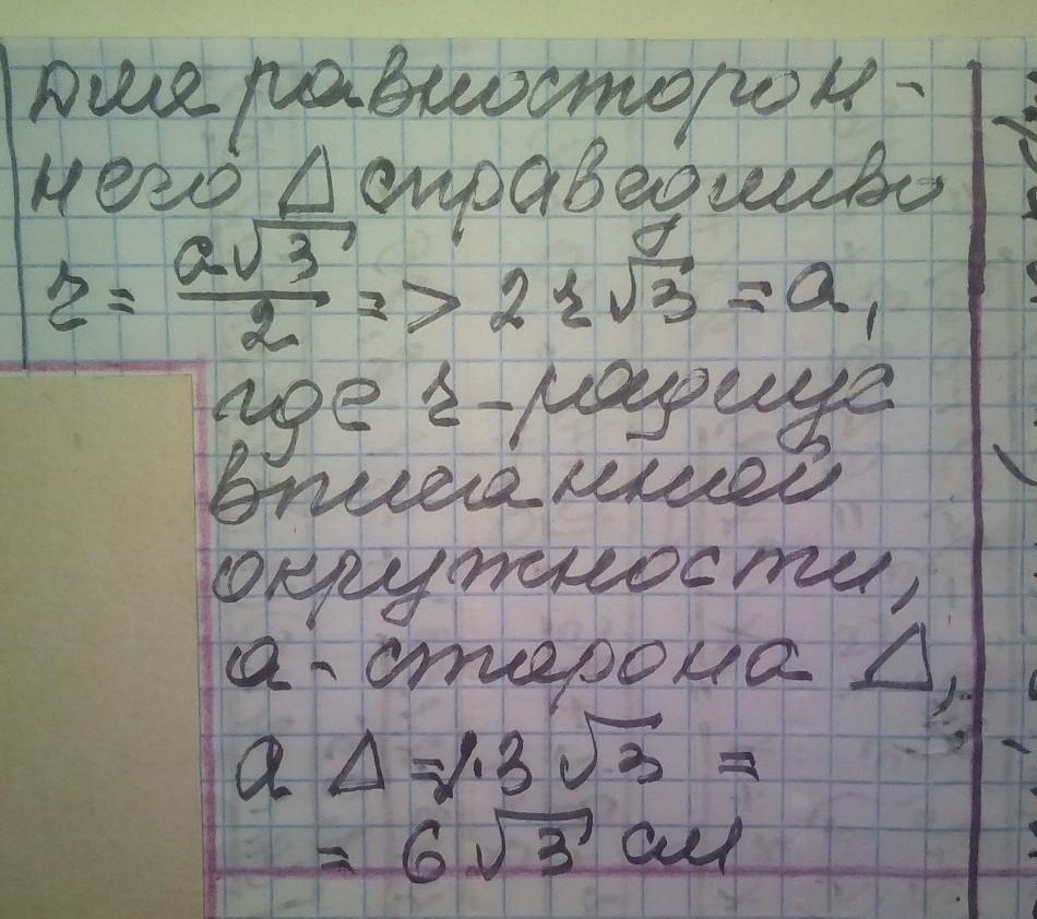 Задача: Радиус окружности, вписанной в равносторонний треугольник, равен 3см. Найдите сторону треугольника