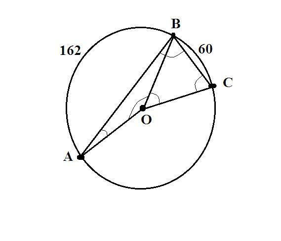 найдите угол ABC, если градусные меры дуг AB и BC равны 160° и 62° соответственно.