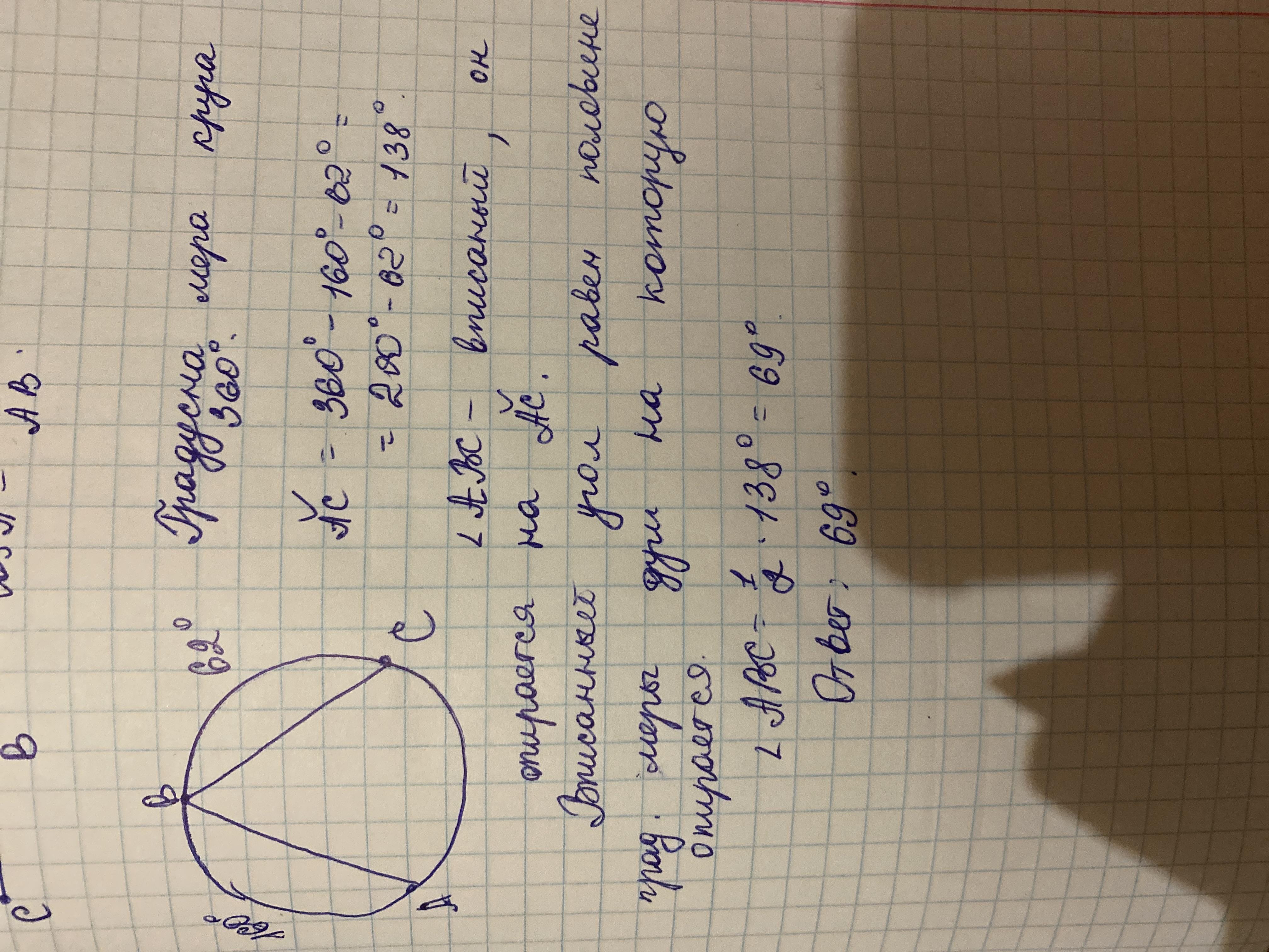 найдите угол ABC, если градусные меры дуг AB и BC равны 160° и 62° соответственно.