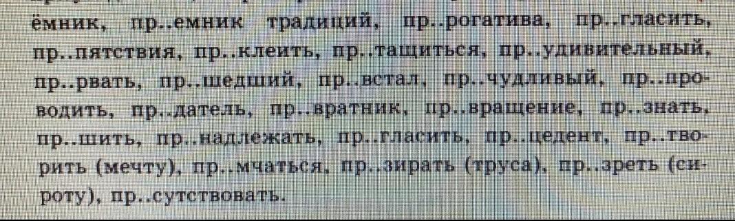 преемник, прерогатива, пригласить, препятствия, приклеить, притащиться, преудивительный , прервать, пришедший, привстал, причудливый, препроводить, предатель, привратник, превращение, признание, пришить, принадлежать, пригласить, прецедент, претворить (мечту) , примчаться, призреть (сироту), присутствовать.