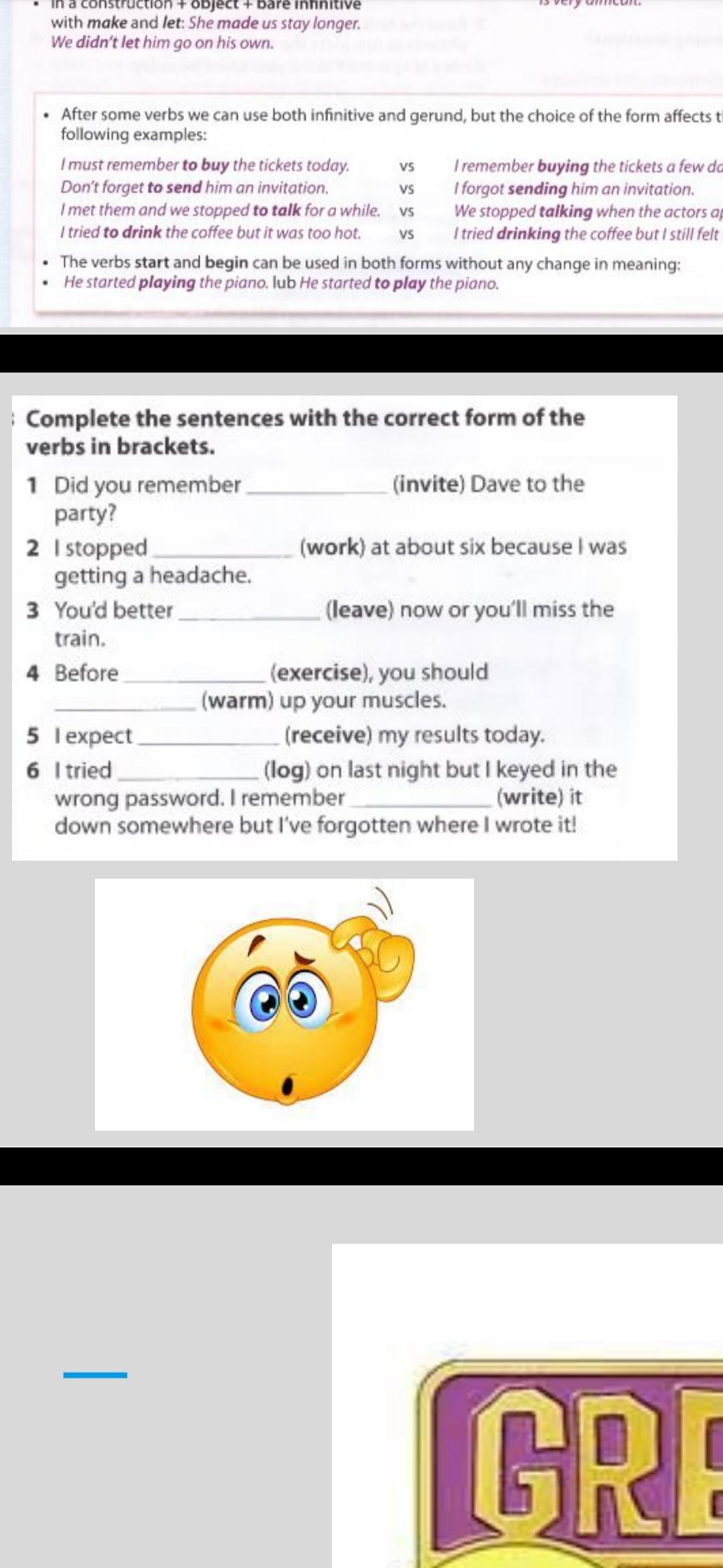 Ответ: 1 inviting 2 working 3 leave 4 exercise, warm 5 receiving 6 logging writing