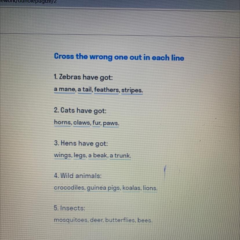 Объяснение:1 У зебр нету перьев 2 у котов нету рог 3 кур нет хобота 4 хомяки не дикие 5 олень не насикомое