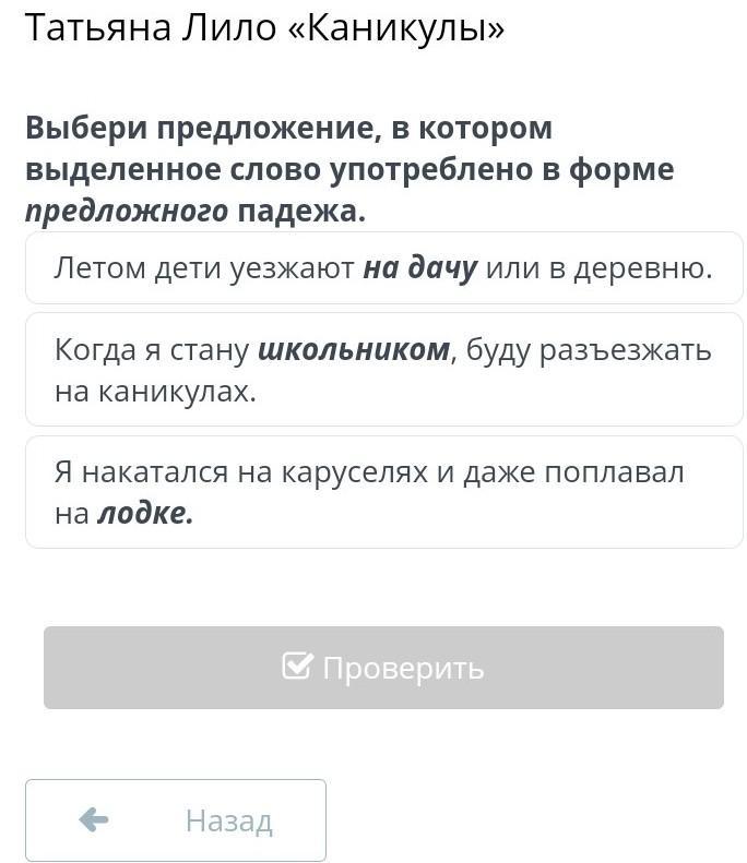 Татьяна Лило «Каникулы» Выбери предложение, в котором выделенное слово употреблено в форме предложного падежа. Летом дети уезжают на дачу или в деревню. Когда я стану школьником, буду разъезжать на каникулах. Я накатался на каруселях и даже поплавал на лодке. Помагите пжжжж