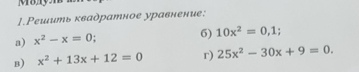 1.Решить квадратное уравнение: а) х2 – х = 0; б) 10х2 = 0,1; ; в) х2 + 13х + 12 = 0 г) 25х2 – 30x + 9 = 0.