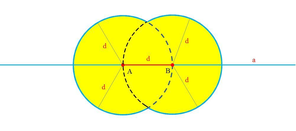 Обоснование. Если точка С принадлежит прямой а, то треугольник не получится. Если точка С принадлежит цветным кругам, то расстояние от точки С до вершины А или В станет равным или меньшим чем d.