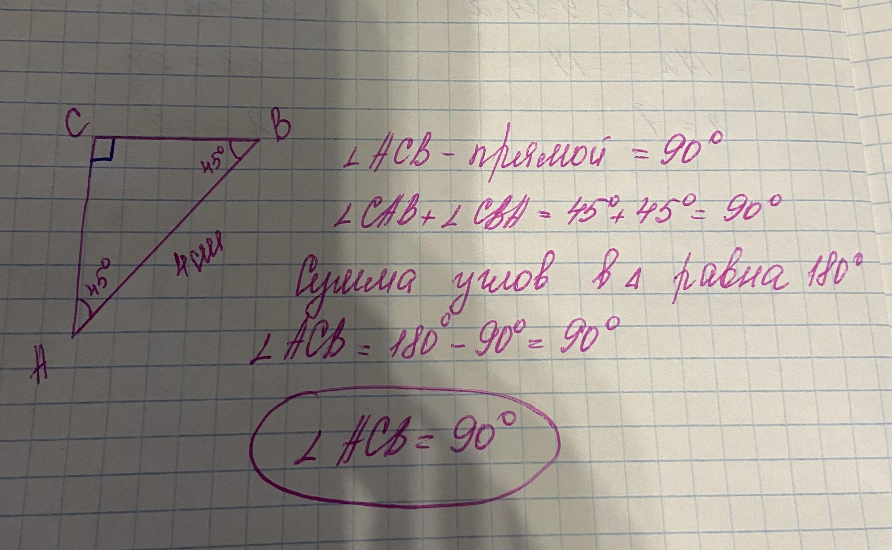 Постройте треугольник АВС со стороной АВ = 4 см, ∠САВ = ∠СВА = 45° . Измерьте угол АСВ. Какой это угол?