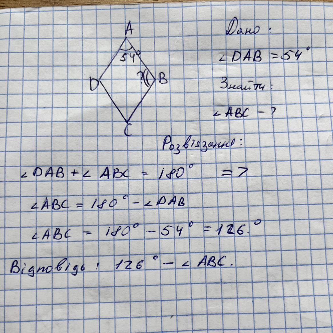 гострий кут ромба дорівнює 54' (градуса). Знайти тупий кут ромба