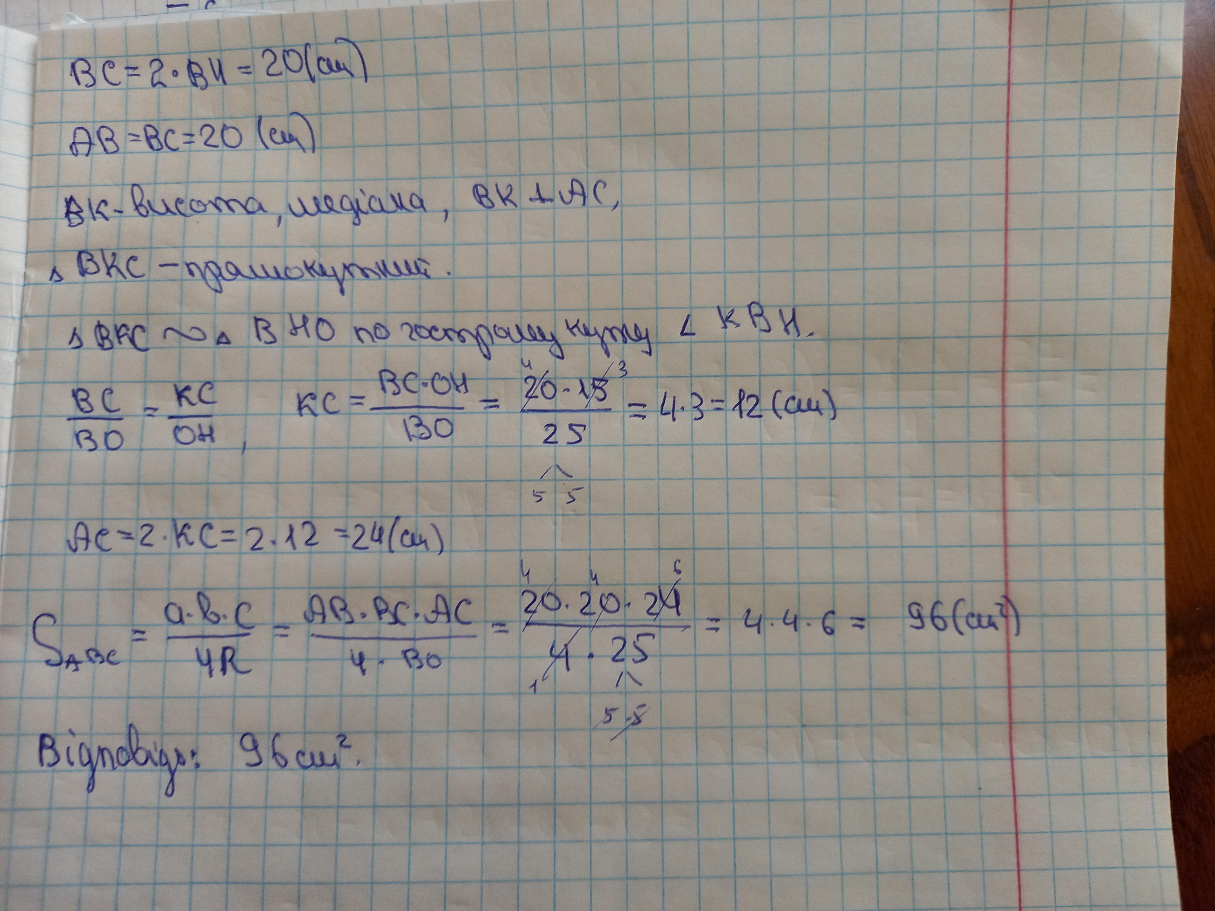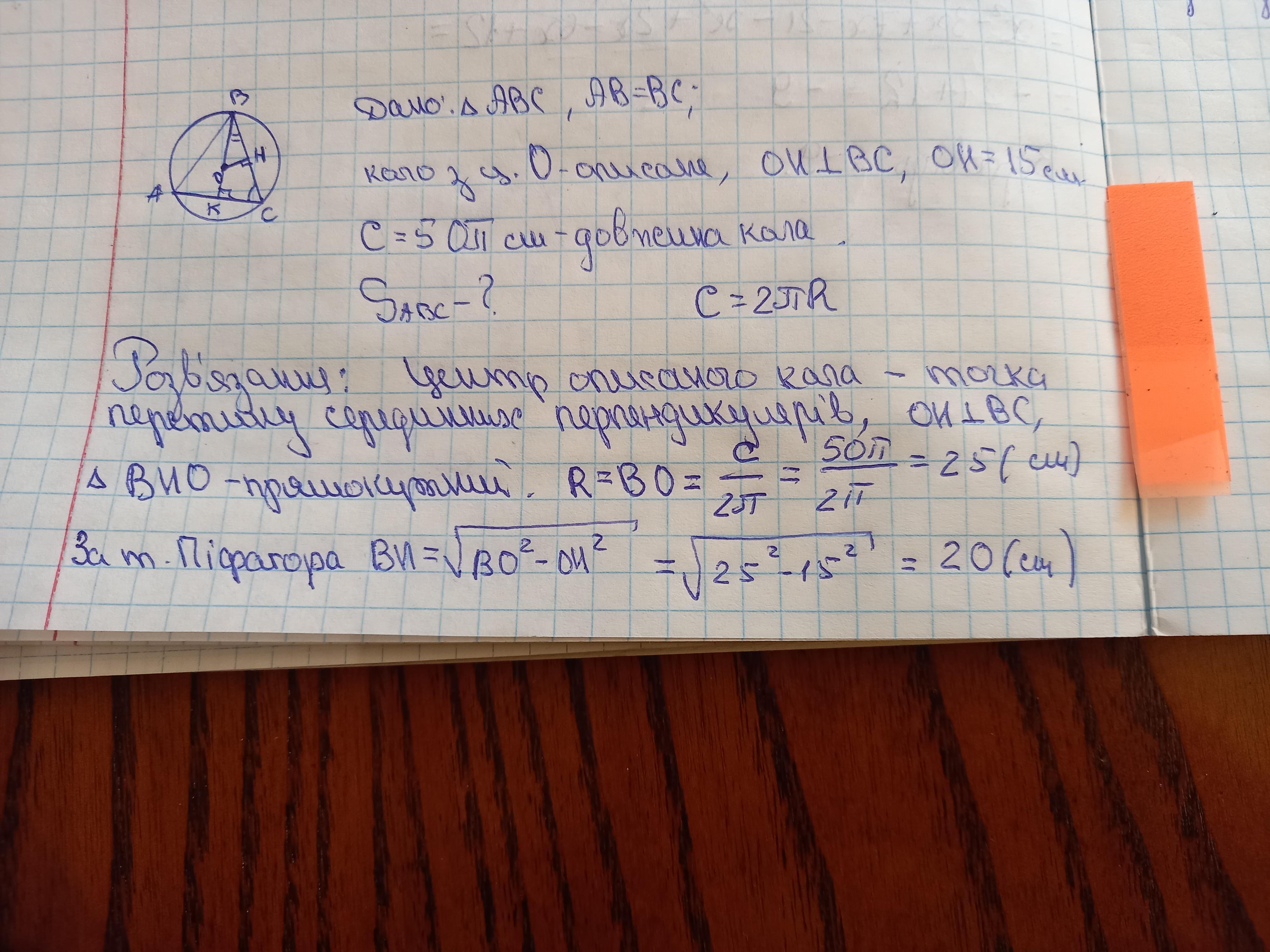 центр кола описаного навколо рівнобедреного трикутника abc, віддалений від бічної сторони вс на відстань 15 см. довжина кола 50 псм. Обчисліть площу трикутника
