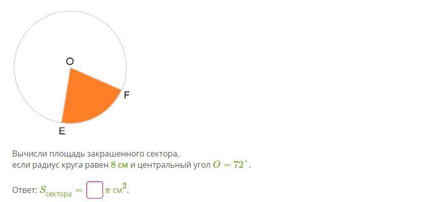Подставляем: (π*8²*72°)/360°=π*64/5=64π/5 см² или 12,8π см²