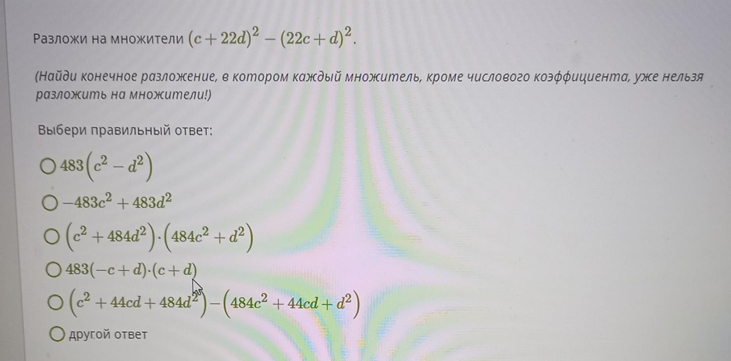 \displaystyle\bf\\(c+22d)^{2} -(22c+d)^{2} =(c+22d+22c+d)(c+22d-22c-d)=\\\\\\=(23c+23d)(-21c+21d)=23\cdot 21(c+d)(-c+d)=\\\\\\=\boxed{483(-c+d)\cdot(c+d)}