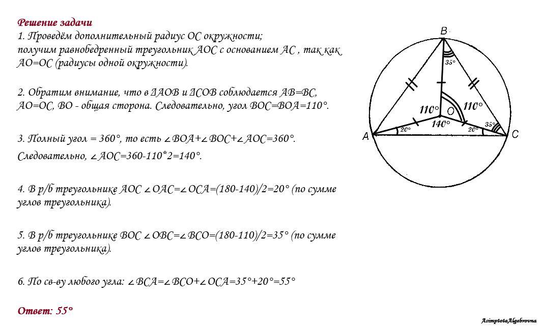 Треугольник АВС вписанный в круг с центром в точке О. Найдите угол С , если АВ=ВС и угол АОВ=110 градусов.
