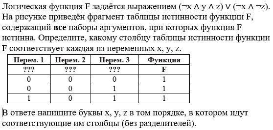 Логическая функция F задаётся выражением (¬x ∧ y ∧ z) ∨ (¬x ∧ ¬z). На рисунке приведён фрагмент таблицы истинности функции F, содержащий все наборы аргументов, при которых функция F