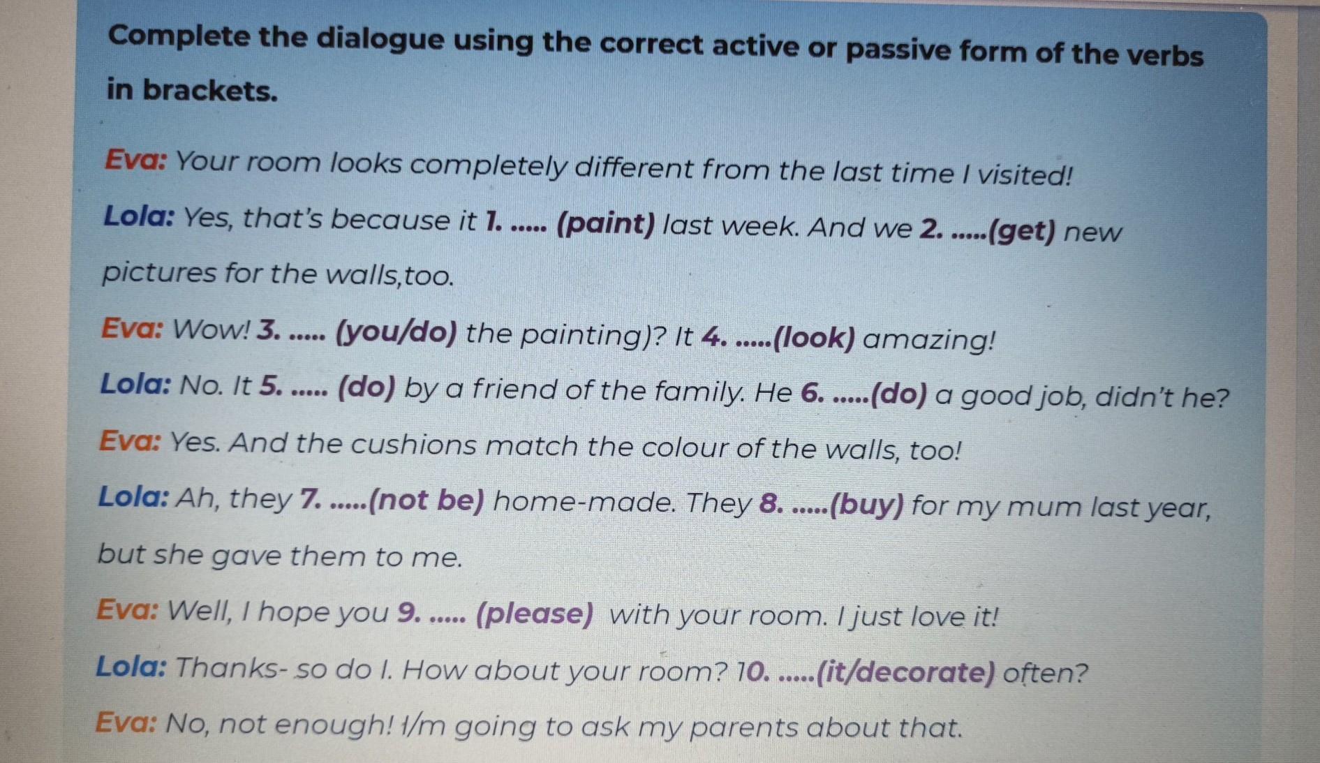3. did you do (Ева спрашивает про то, что именно Лола покрасила стену на прошлой неделе, а не про то, что Лола по жизни красит стены, поэтому Past Simple)