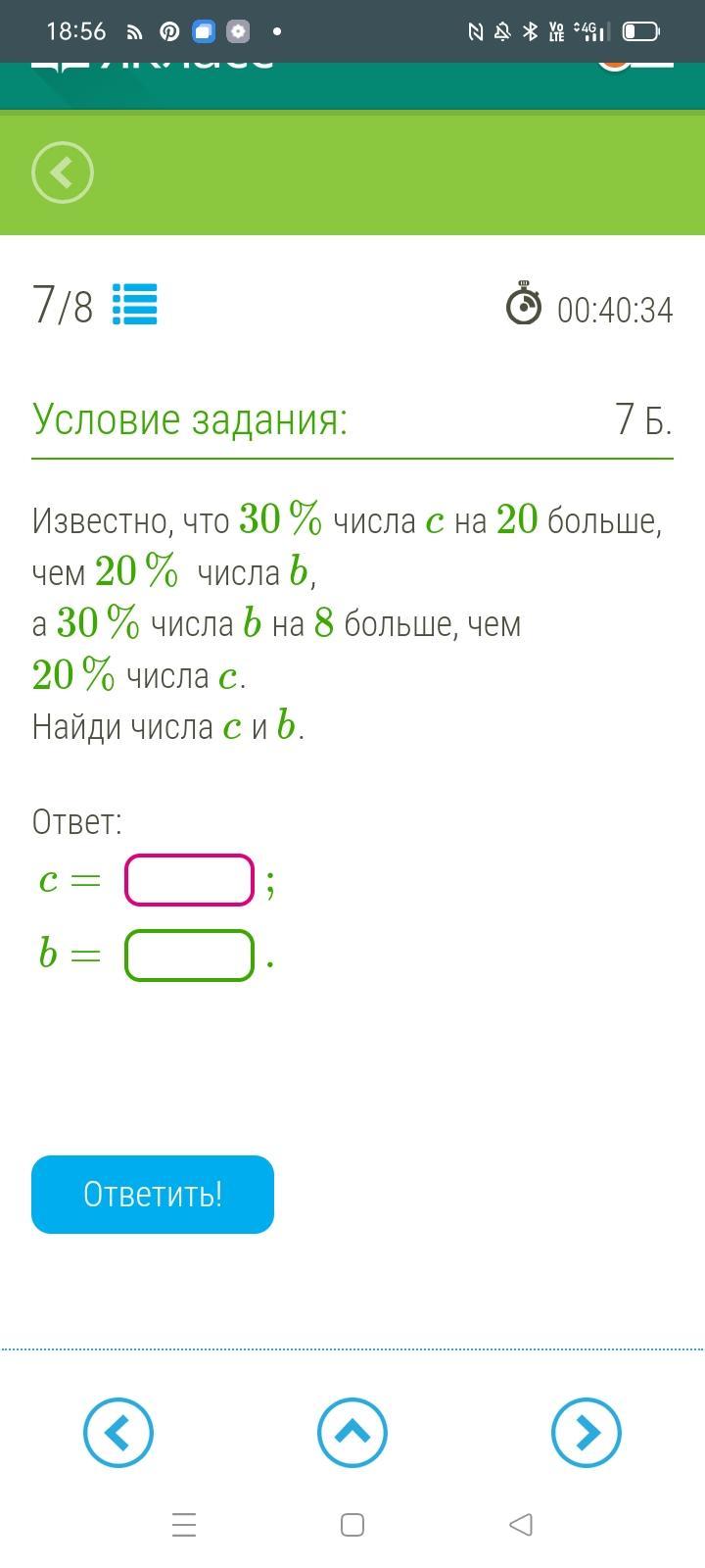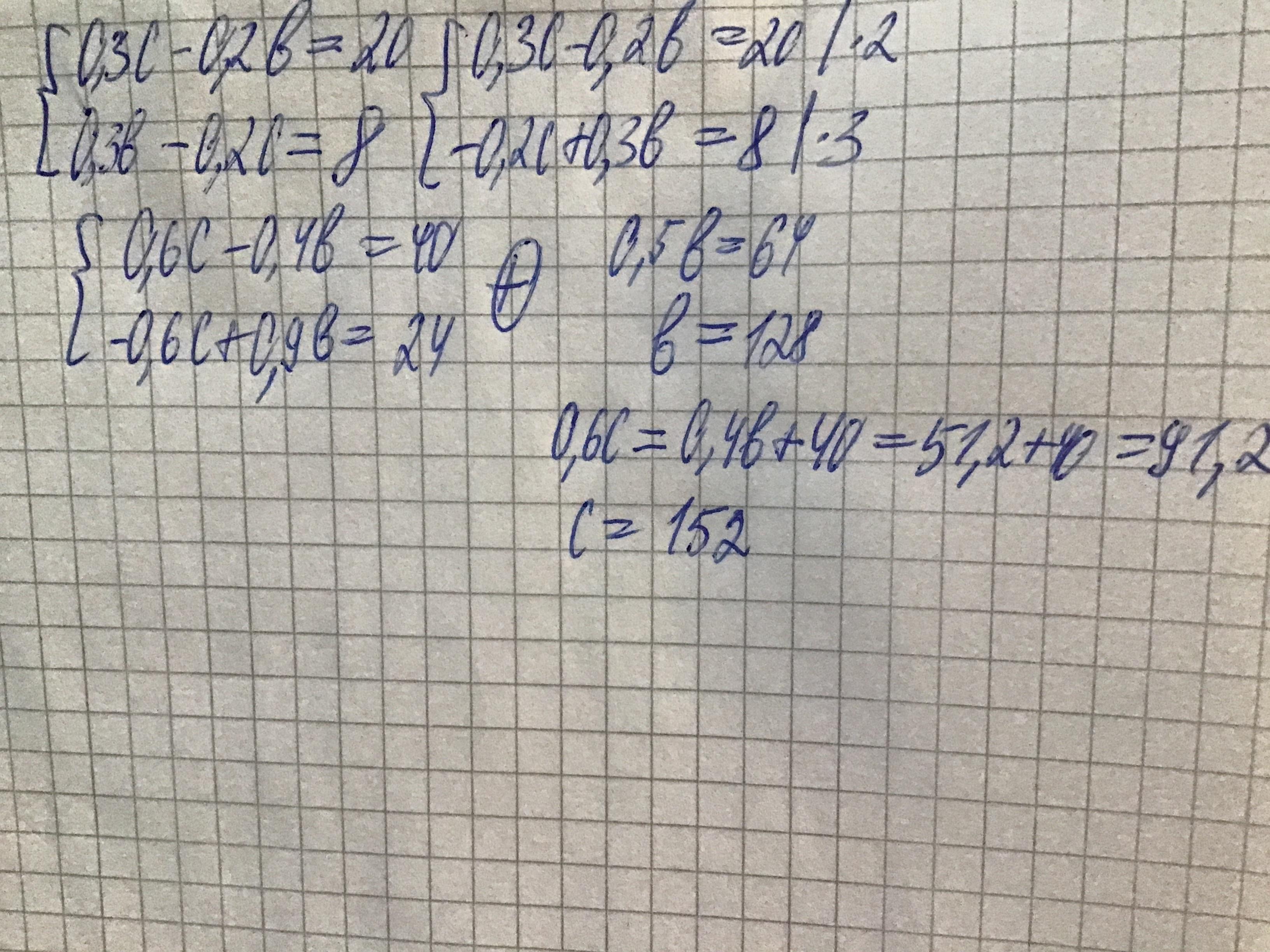 Известно, что 30 % числа с на 20 больше, чем 20% числа b, а 30 % числа b на 8 больше, чем 20% числа с. Найди числа с и b.