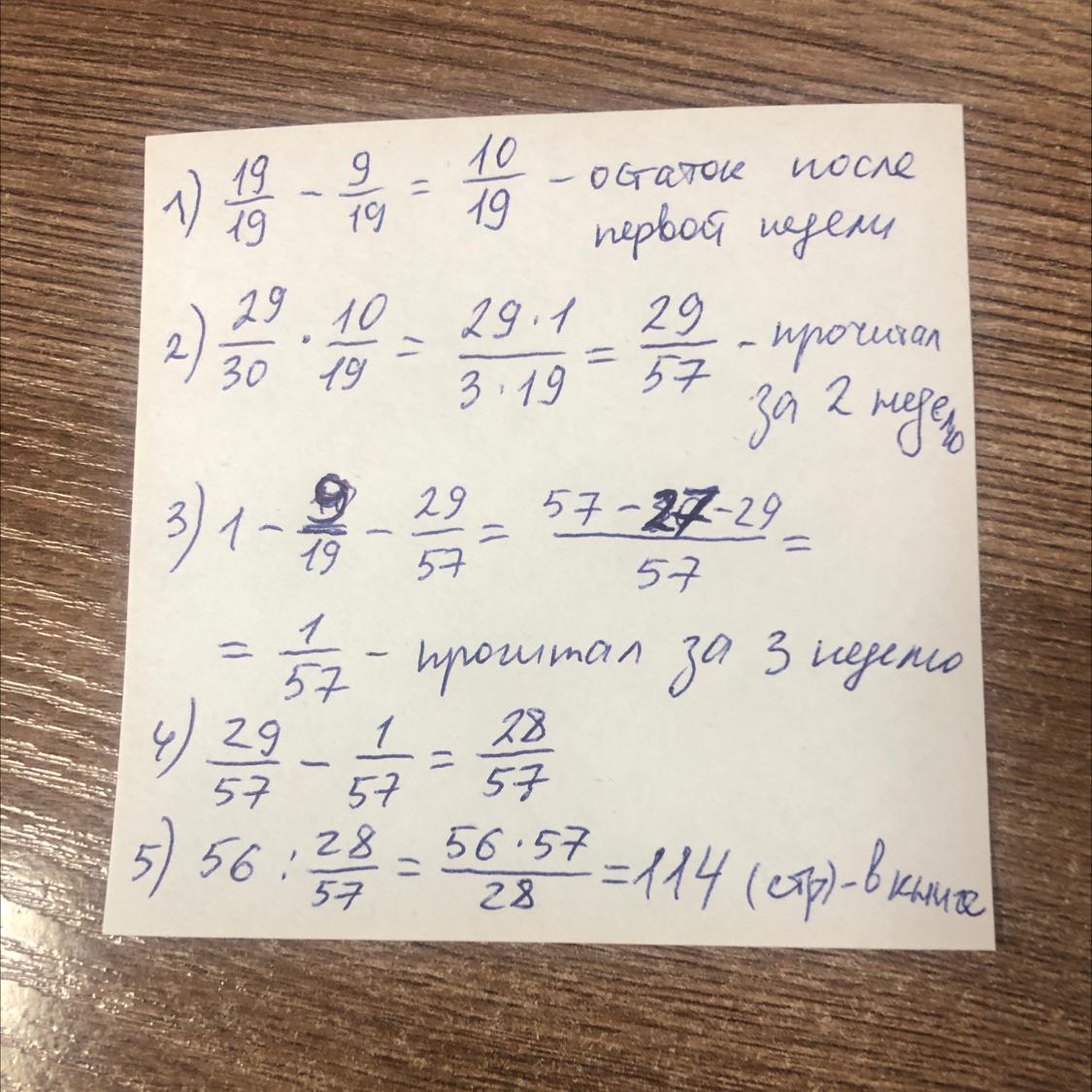 (1-9/19)×29/30=29/57 книги прочитал за вторую неделю.