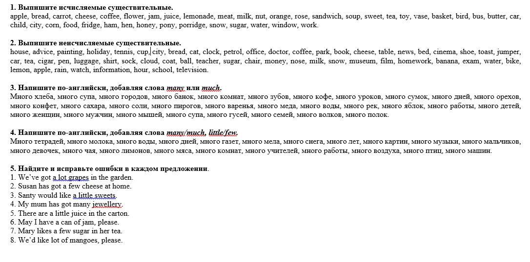 4. little/few - не поняла зачем они в задании, если там только "много" написано
