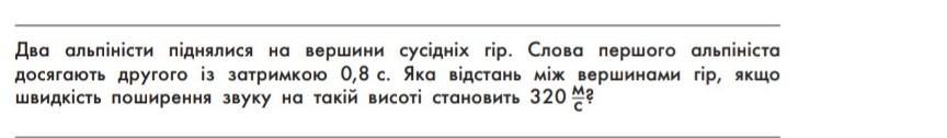 Два альпіністи піднялися на вершини сусідніх гір. Слова першого альпініста досягають другого із затримкою 0,8 с. Яка відстань між вершинами гір, якщо швидкість поширення звуку на такій висоті становить 320 мг помогите пожайлуста;(