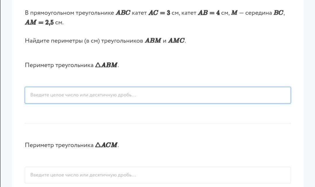 нам дан египетский треугольник АВС, в котором АС=3, АВ=4, тогда гипотенуза ВС=5, ее половина равна 2.5,а и равна медиане АМ, поэтому для подсчета периметра есть все данные