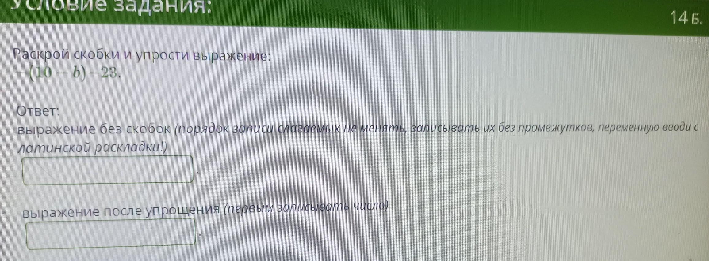 СРОЧНО! 1 ДЕНЬ! Раскрой скобки и упрости выражение: -(10 – b) – 23. Ответ: выражение без скобок (порядок записи слагаемых не менять записывать их без промежутков, переменную вводи с латинской раскладки!) выражение после упрощения (первым записывать число)
