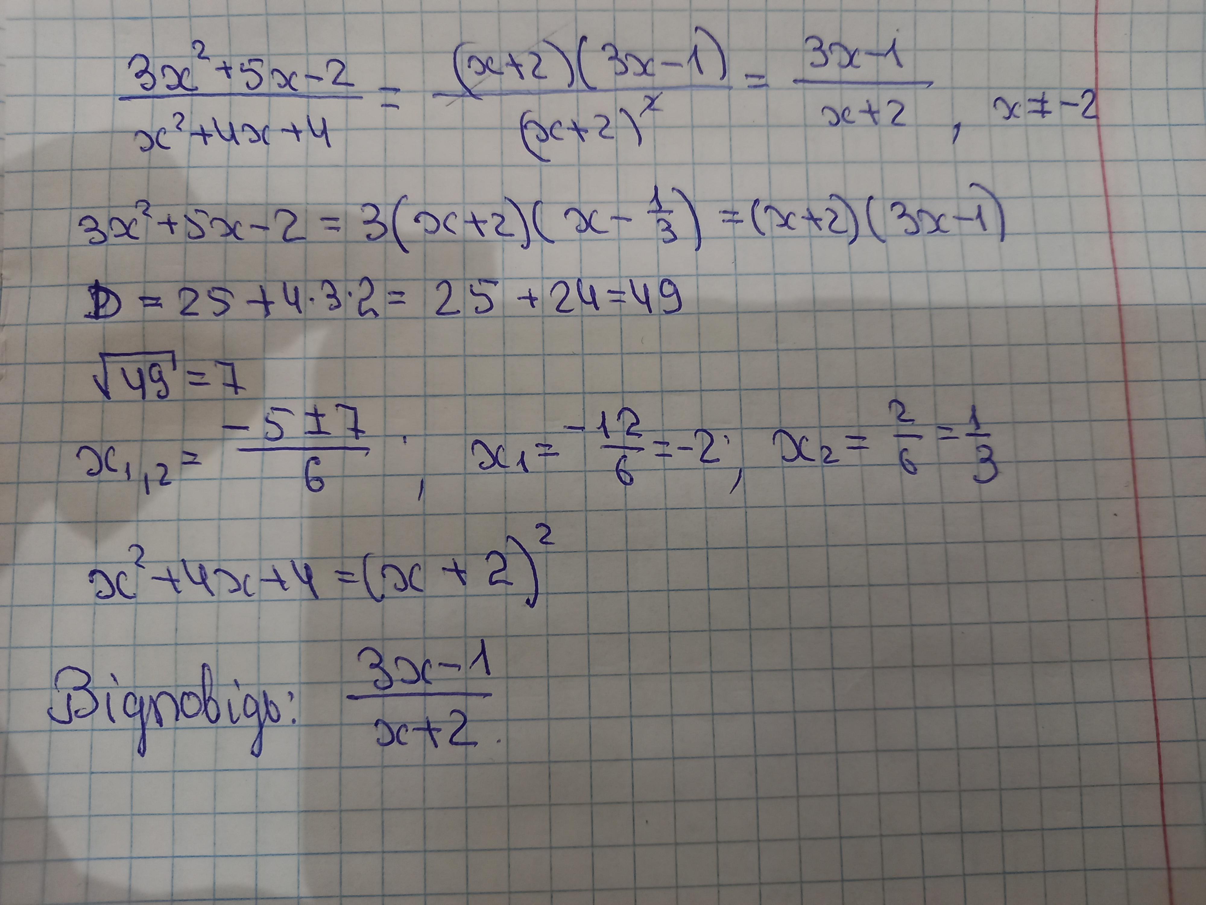 скоротити дріб: 3х²+5х-2/х²+4х+4