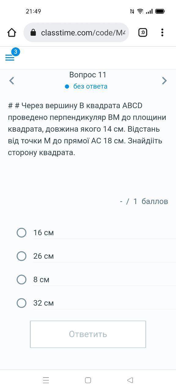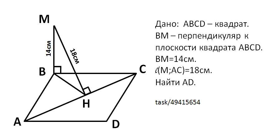 Через вершину В квадрата ABCD проведено перпендикуляр ВМ к плоскости квадрата, длина которого равна 14см. Расстояние от точки М до прямой АС равно 18см. Найти сторону квадрата.