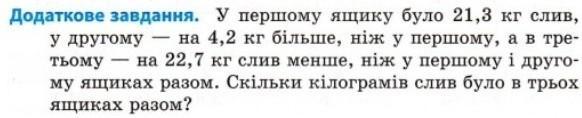 Додаткове завдання. У першому ящику було 21,3 кг слив, у другому на 4,2 кг більше, ніж у першому, а в тре- тьому на 22,7 кг слив менше, ніж у першому і друго- му ящиках разом. Скільки кілограмів слив було в трьох ящиках разом? помогите пожалуйста