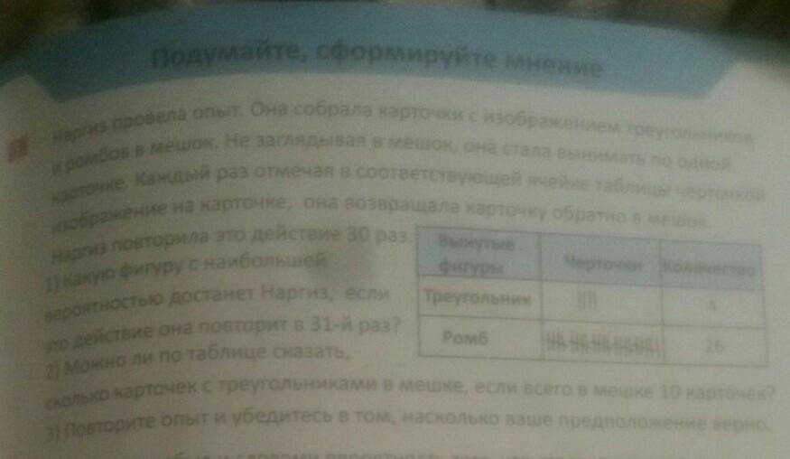 наргиз провела опыт.Она собрала карточки с изображением треугольников и ромбов в мешок.Не заглядывая в мешок она стала вынимать по одной карточке крч вот фото помогите пж