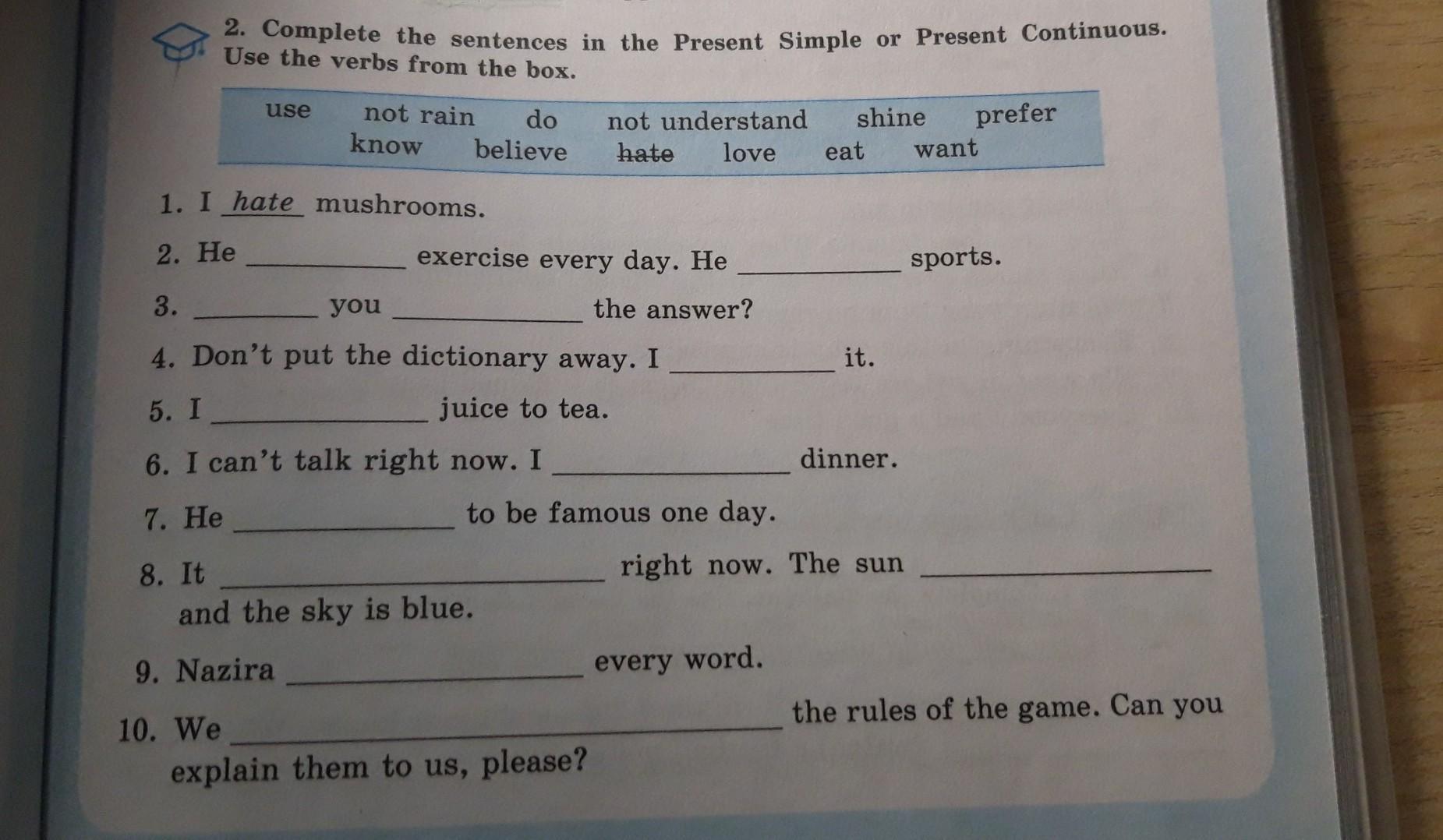 2. Complete the sentences in the Present Simple or Present Continuous. Use the verbs from the box.