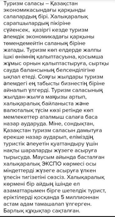 оқылым мәтіні мен диаграмманы пайдаланып, Қазақстанда туризм саласы күннен күнге дамуда эссе срочно