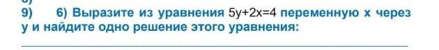 6) Выразите из уравнения 5у+2х=4 переменную х через у и найдите одно решение этого уравнения: