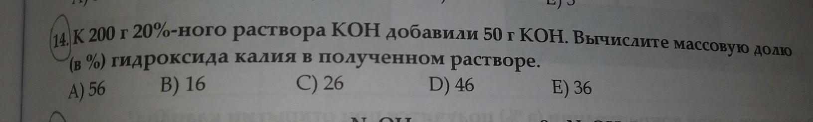 14. К 200 г 20%-ного раствора КОН добавили 50г КОН. Вычислите массовую долю (в %) гидроксида калия в полученном растворе.