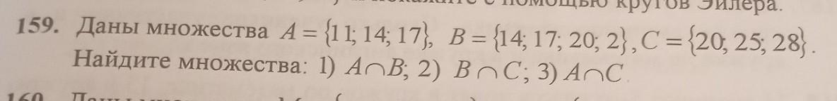 159. Даны множества A = {11; 14; 17), B = {14; 17; 20; 2), C = {20, 25, 28}. Найдите множества: 1) АВ; 2) BoС; 3) АпC. 160. Даны множества М - Ха. 4. 9. с. 16 o, L. 1с. АТ до