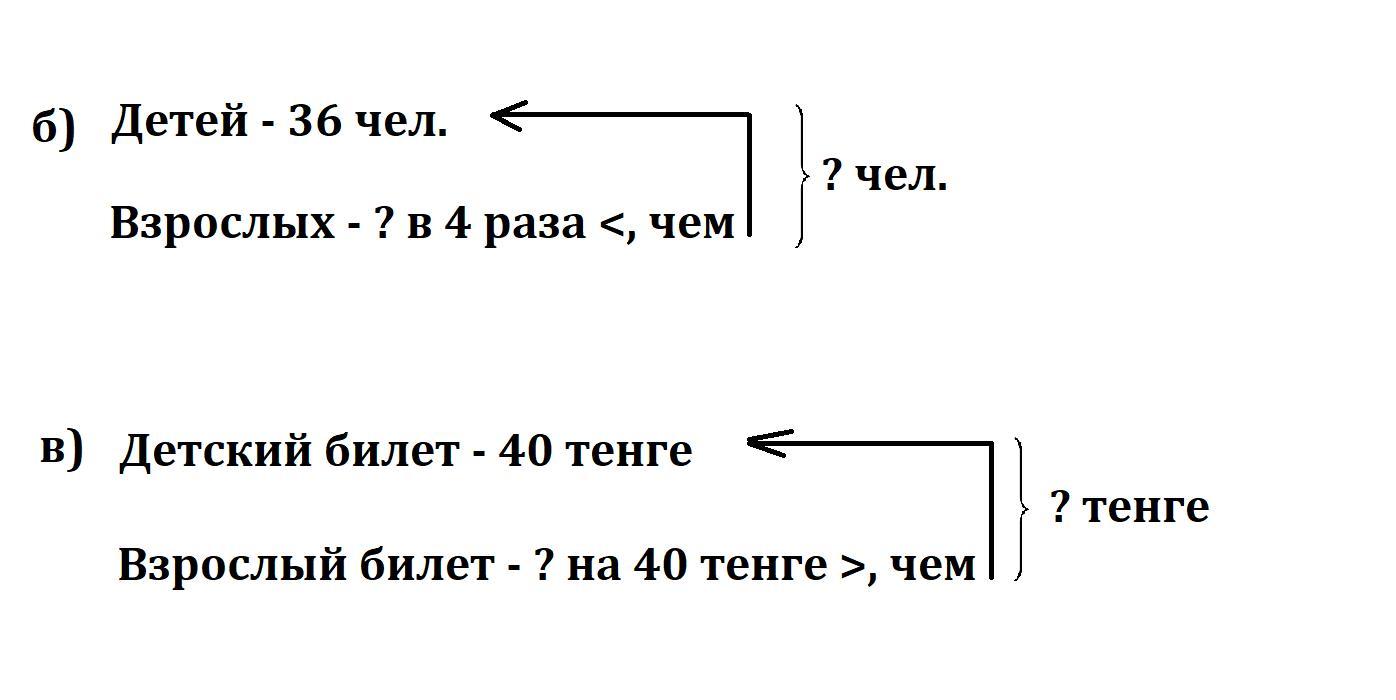б) в автобусе ехали 36 детей, что в 4 раза больше, чем взрослых. Сколько всего человек ехало в автобусе? в) Детский билет стоит 40 тенге, что на 40 тенге дешевле взрос- лого. Сколько нужно заплатить за один детский и один взрослый билет вместе? помогите с условием задачи пожжж