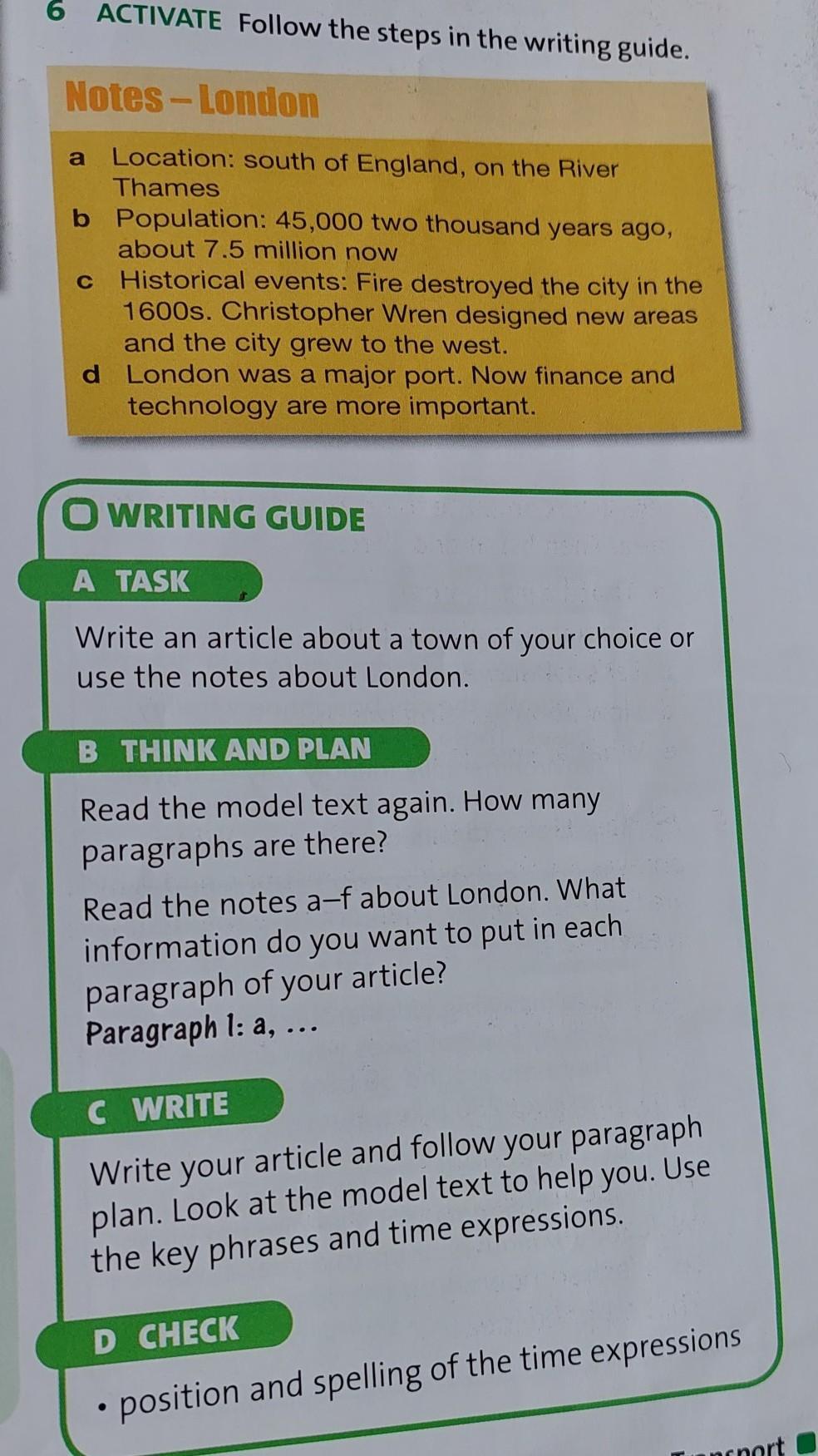 6 ACTIVATE Follow the steps in the writing guide. Notes-London a Location: south of England, on the River Thames b Population: 45,000 two thousand years ago, about 7.5 million now c Historical events: Fire destroyed the city in the 1600s. Christopher Wren designed new areas and the city grew to the west. d London was a major port. Now finance and technology are more important. O WRITING GUIDE A TASK Write an article about a town of your choice or use the notes about London. B THINK AND PLAN y? Read the model text again. How many paragraphs are there? Read the notes a-f about London. What information do you want to put in each paragraph of your article? Paragraph 1: a, ... S C WRITE Write your article and follow your paragraph plan. Look at the model text to help you. Use the key phrases and time expressions. D CHECK • position and spelling of the time expressions