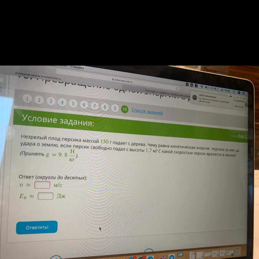 Не зрелый плод персика массой 150 г падает с дерева. чему равна кинетическая энергия персика за миг до удара о землю, если персик свободно падает с высоты 1,7 м? с какой скоростью персик врежется в землю?