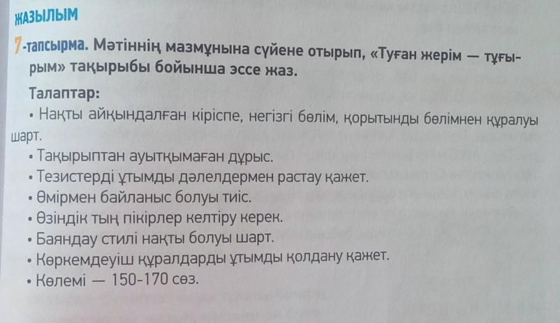 ЖАЗЫЛЫМ 7-тапсырма. Мәтіннің мазмұнына сүйене отырып, «Туған жерім-тұғырым» тықырыбы бойынша эссе жаз