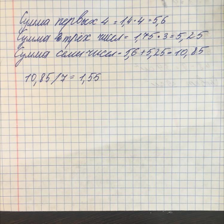 Среднее арифметическое четырёх чисел равно 1,4,а среднее арифметическое трёх других чисел - 1,75.