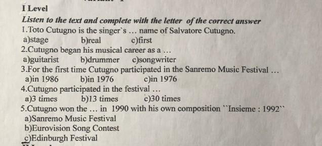 3.For the first time Cutugno participated in the Sanremo Music Festival.... a)in 1986 b)in 1976 c)in 1976