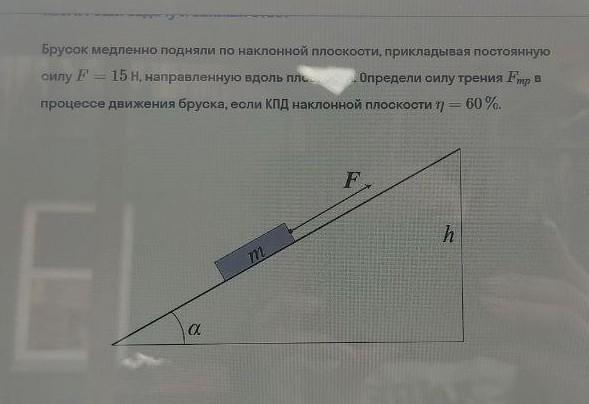 брусок медленно подняли по наклонной плоскости прикладывая постоянную силу 15 ньютонов направленную вдоль плоскости