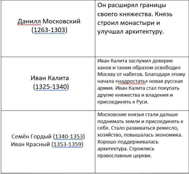 А) Перечислите политические успехи московских князей, которые позволили возвысить Москву над другими княжествами, укажите не менее трёх князей.