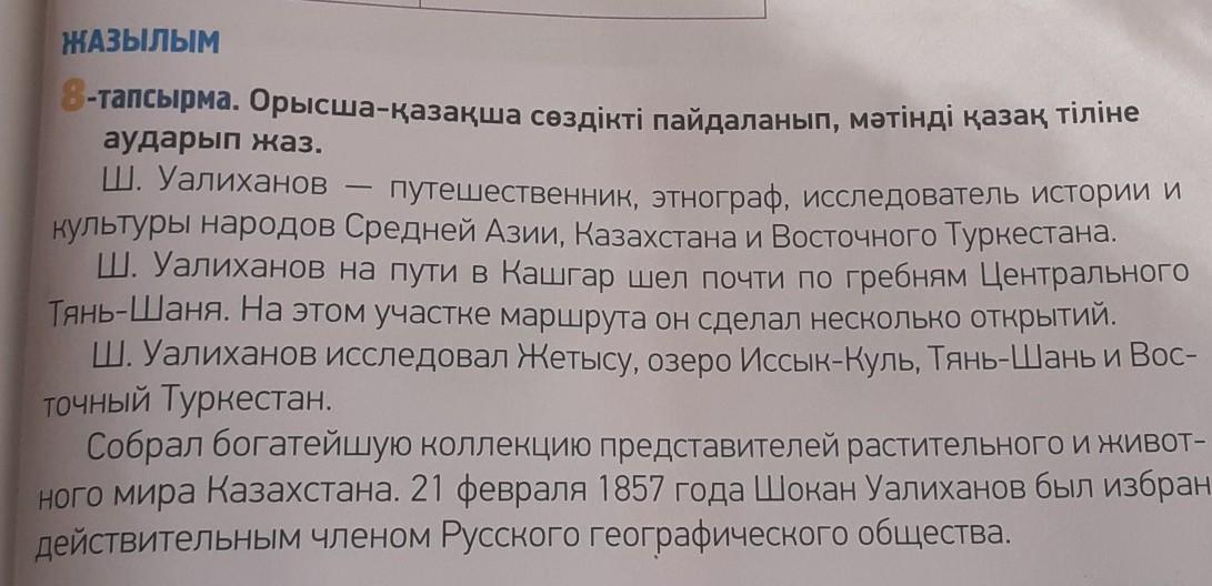 Ш.Уәлиханов – саяхатшы, этнограф, Орталық Азия, Қазақстан және Шығыс Түркістан халықтарының тарихы мен мәдениетін зерттеуші. Ш.Уәлиханов Қашрарға барар жолында Орталық Тань-Шань жоталарымен дерлік жүріп өтті.Маршруттың осы бөлігінде ол бірнеше жаңалықтар ашты. Ш.Уәлиханов Жетісуды, Ыстықкөлді, Тянь-Шаньды, Шығыс Түркістанды зерттеді. Қазақстанның флорасы мен фаунасы өкілдерінің ең бай коллекциясын жинады. 1857 жылы 21 ақпанда Шоқан Уәлиханов сайланды. Орыс географиялық қоғамының толық мүшесі.