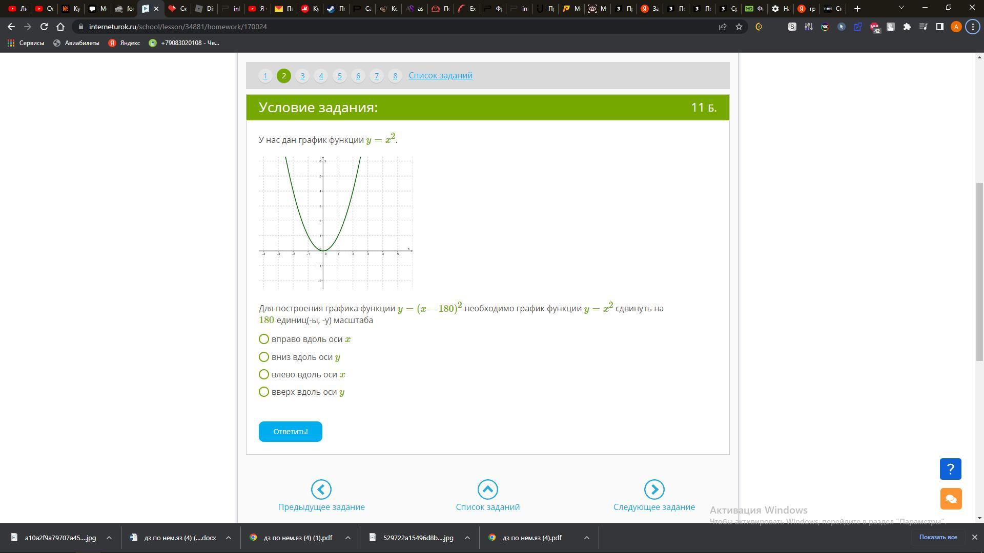 Для построения графика функции y=(x−180)2 необходимо график функции y=x2 сдвинуть на 180 единиц(-ы, -у) масштаба