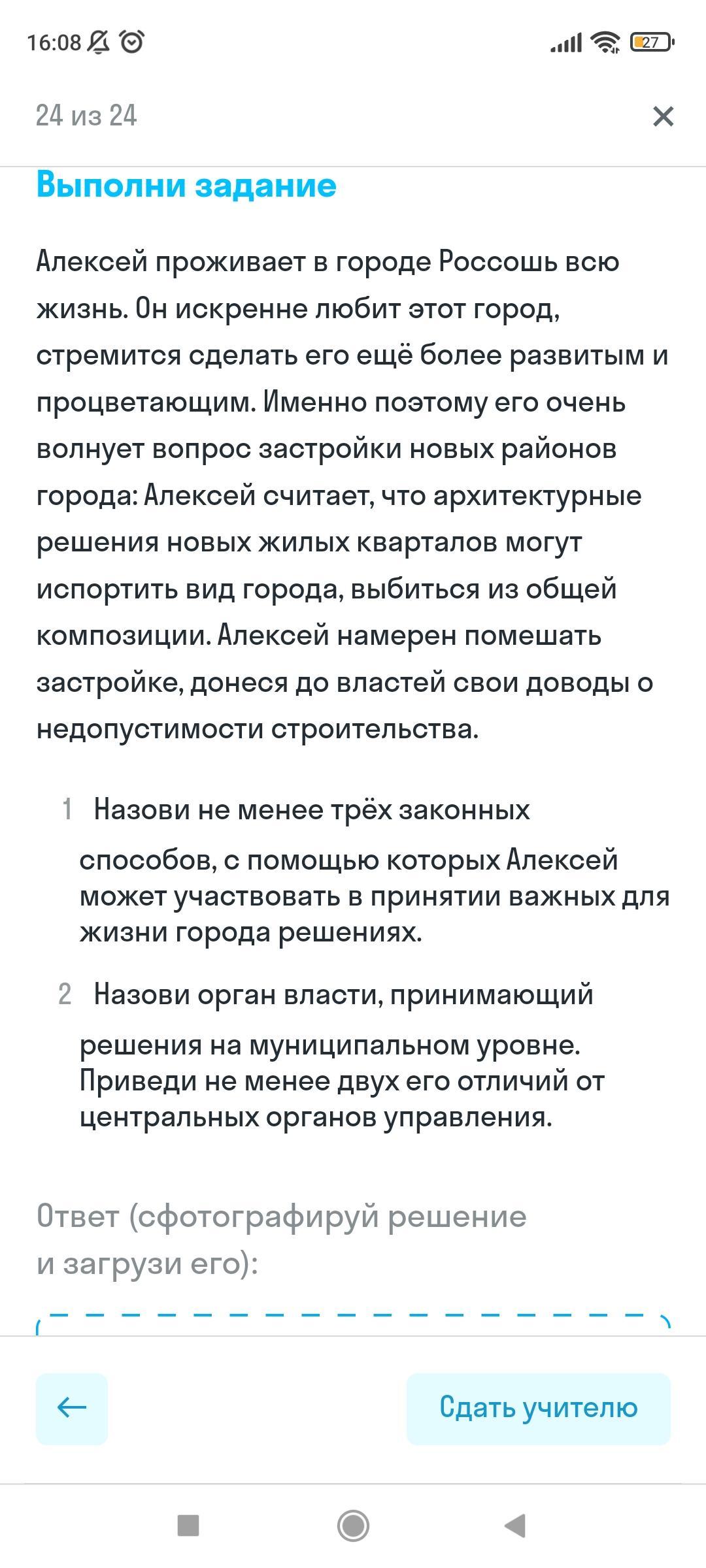 1 Назовите не менее 3 законных способов, с помощью которых Алексей может учавствовать в принятии важных для жизни города решениях.